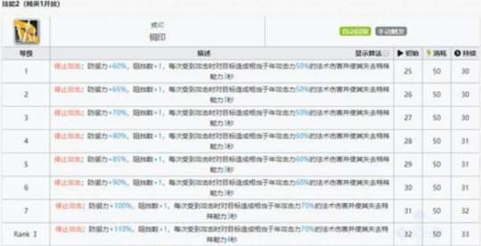 技能描述(7级):此技能可以让我停止攻击,防御力增加100%,阻挡数增加1次。每次受到攻击时,我可以对攻击者造成相当于我的年攻击力70%的法术伤害,并使其失去特殊能力3秒。这个技能相较于一技能要更加强大,因为它可以同时具备攻守能力,可以专精于使用。