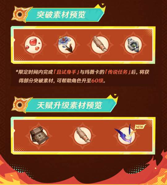 玛薇卡和专武突破材料官方已经公布!为方便准备材料给大家做了一张图,下图为玛薇卡90级天赋9/9/9材料和专武焚曜千阳90级材料!