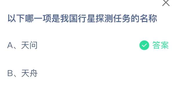 软件提交 专题合集 热门手游以下哪一项是我国行星探测任务的名称?支付宝小鸡课堂开课啦!每天花一分钟答题赚饲料,喂喂小鸡就能贡献爱心啦!轻松又意义十足!2025年10月25日蚂蚁庄园的小鸡课堂题目正确答案是【天问】,2020年4月24日,国家航天局正式宣布将行星探测任务命名为“天问系列”.