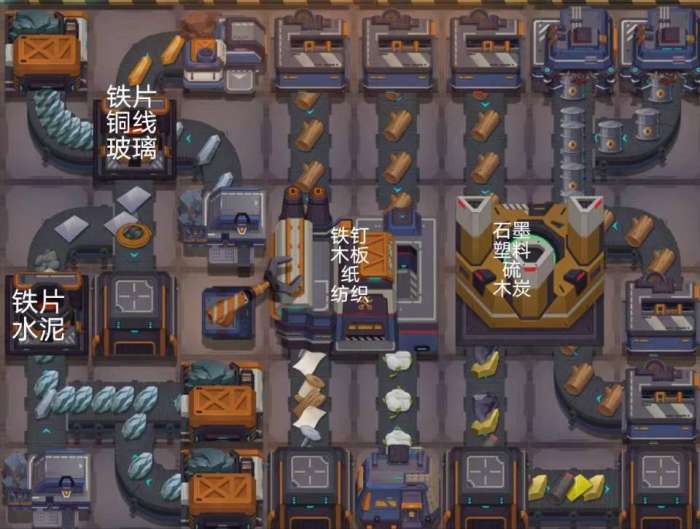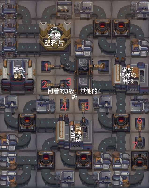 建议前期直接按图3摆一个红绿蓝三种瓶子的生产线。这样前期不会频繁换瓶子模块。工厂没解锁就先把格子空在那,先生产已经解锁的瓶子。图3中7个长夹子,一个短夹子。可以不用是4级,但要保持建筑等级一致。