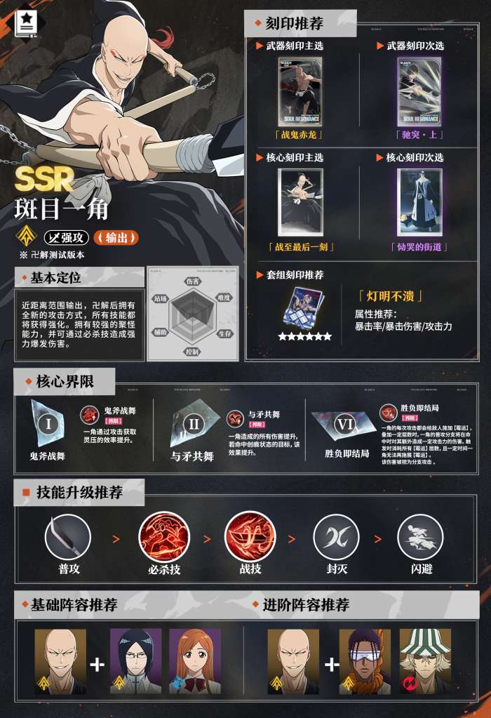 一角是一名专注输出的突系死神,他的斩魄刀是鬼灯丸,可以通过分支攻击与战技快速突进到敌人面前,同时自身也拥有一定的聚怪能力;卍解后的龙纹鬼灯丸会带来全新的近身大范围攻击方式,还有二段必杀可造成强力爆发伤害,是突系队伍的主力输出哦!