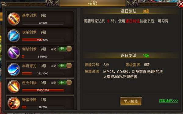 2、玩家可以在技能界面浏览各个技能的介绍说明和升级技能,也可以直接在主界面点击技能图标查看技能介绍,非常方便。