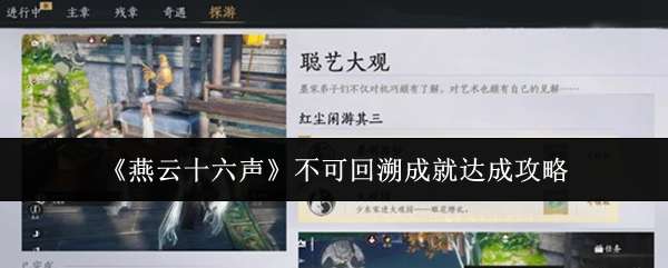 软件提交 专题合集 热门手游燕云十六声不可回溯成就怎么达成?燕云十六声中的每个区域都有非常多可以探索的故事,玩家可以自行探索游戏中大世界地图,可以触发奇遇、探游等玩法,那么新探游聪艺大观应该怎么完成呢? 小编为你准备了一份攻略,一起来看看吧。