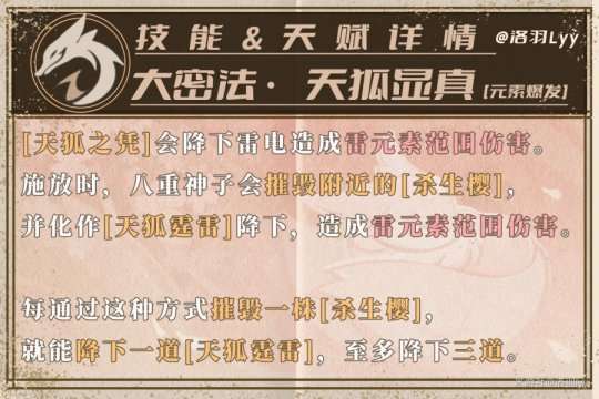◆「天狐之凭」造成高额雷元素范围伤害并摧毁「杀生樱」,基于被摧毁的「杀生樱」的数量化作「天狐霆雷」,额外造成与其数量相等的雷元素范围伤害,击中敌人后为其施加弱雷元素附着;