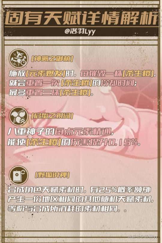 神子位于后台时,「杀生樱」依旧可以对敌人打出雷元素伤害,所以优先对「元素战技」进行升级;
