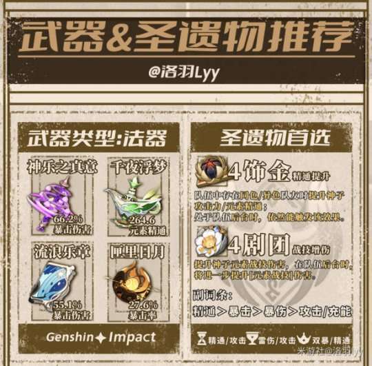 神子的主要玩法是激化/雷伤,武器的选择可以考虑精通 / 双暴;若不是激化/绽放队伍时,可以优先选择提升双暴/攻击的武器;