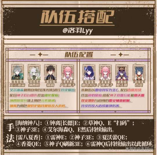 本队以雷电将军为核心,配合香菱持续打出超载反应;搭配神子双雷充能和夏沃雷双火增伤与自身的雷火辅助机制,持续对敌人造成循环伤害。