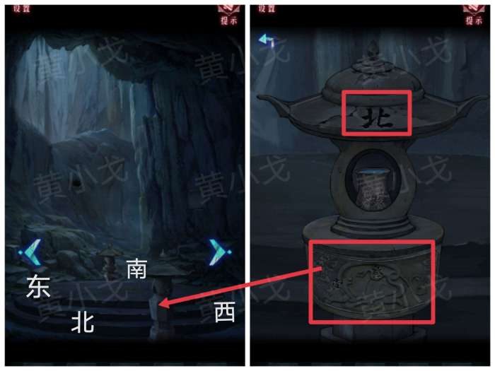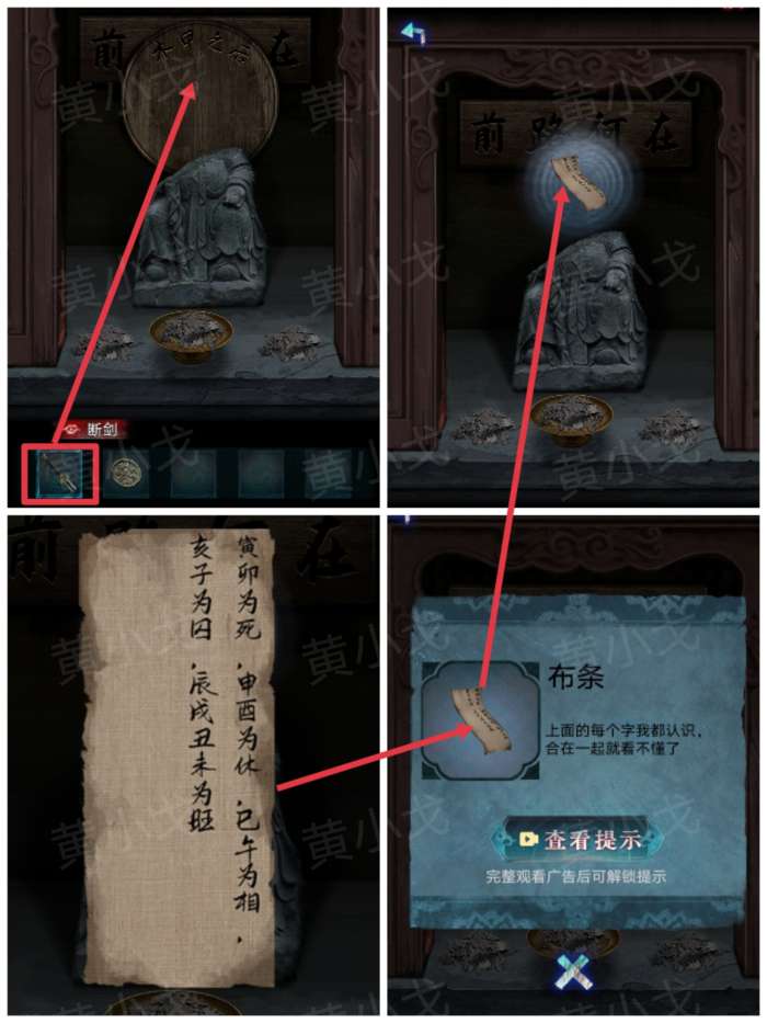 6.进入山洞,根据被烧毁的纸条上的线索,结合【布条】上的线索,依次选择甬道内的“未午”、“辰丑”、“巳戌”
