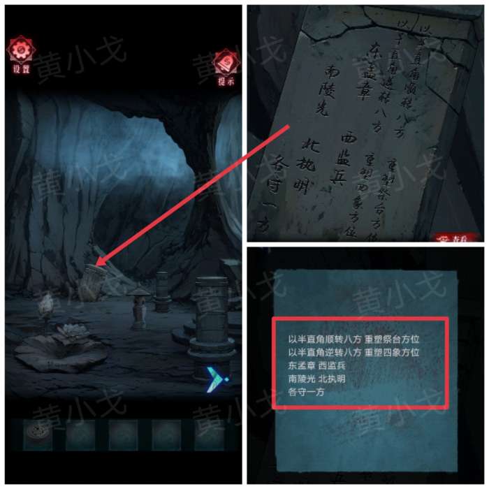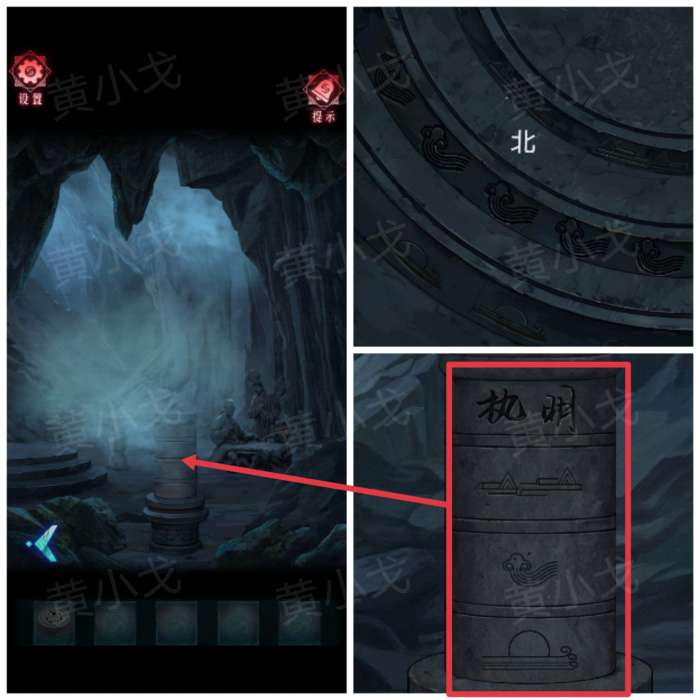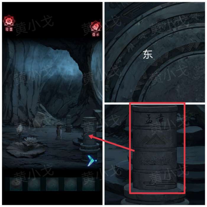 12.点击刻着“孟章”的圆柱,根据石碑和祭台台阶上刻着的花纹线索,调整圆柱上的花纹
