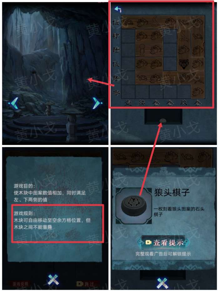 8.点击石壁上的机关,查看游戏说明,完成小游戏;打开暗格,获得【狼头棋子】