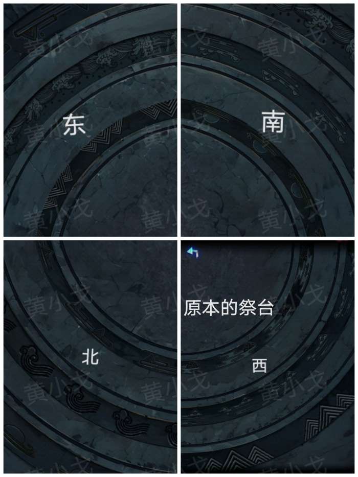 根据装银杯的石柱上的方向北和以半直角顺转八方,重塑祭台方位;以半直角逆转八方,重塑四象方位→得出祭台方位是顺时针旋钮45°得出的结果,四象方位是逆时针45°得出的结果→可以推出祭台原本的方位