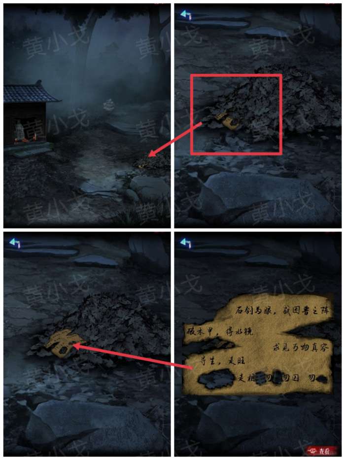 1.点击地上的落叶堆,拨开落叶,查看被烧毁的纸条,获得线索