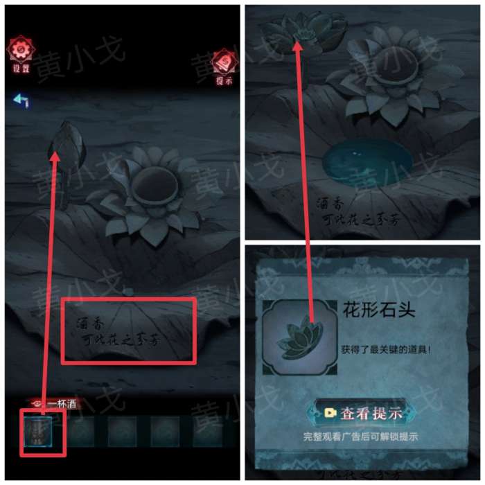 20.根据荷叶上的提示,用【一杯酒】淋荷花,花开,获得【花形石头】,触发剧情