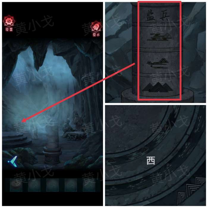 15.点击刻着“监兵”的圆柱,根据石碑和祭台台阶上刻着的花纹线索,调整圆柱上的花纹
