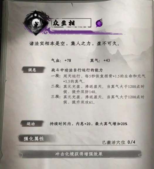 第五部众生相,玩家前往(738,1237)这个位点,击败该位点上的boss武阳,就可以成功解锁该秘籍。玩家在用功后,内吸可增加20,最大真气增加20%。