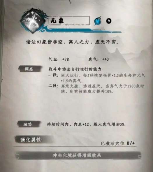第六部无相心法,该秘籍的获得位点为(1540,1274),玩家在用功的时候可在持续时间内,增加内息12,最大真气增加5%。