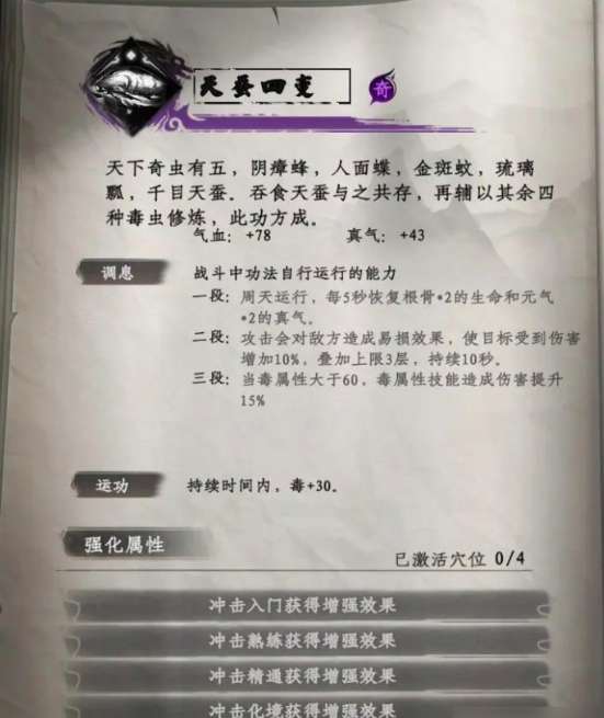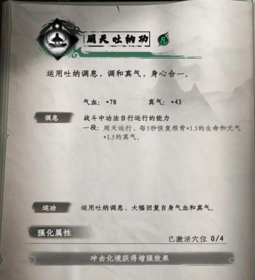 第三部秘籍是周天吐纳功,通过完成主线内容就能够自动获取。在战斗当中,该工法可自行运作,在吐纳调息后,则可以大幅度回升自身的气血值和真气值。