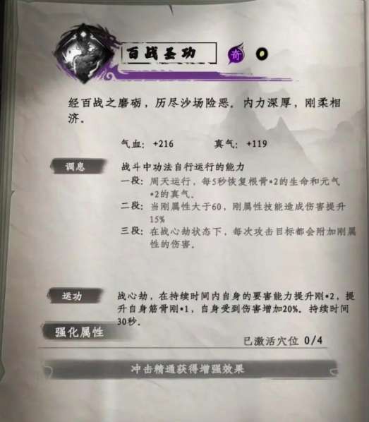 第四部百战圣功,在获取线索上,与第一部白首太玄经的第5把钥匙的寻找,有着密切关系。当玩家完成第5把钥匙的寻找后也可解锁百战圣功,在使用战心劫,持续时间内自身的要害能力提升二倍,提升自身筋骨刚硬程度一倍,且自身受到伤害可增加20%,持续时间更长达30秒。
