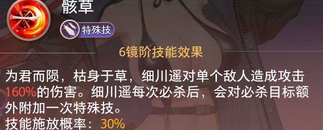 实战价值:这是细川遥的「补刀神器」——必杀后追加的160%攻击伤害虽不突出,但能进一步压低目标血线(尤其配合必杀的穿透效果),对残血敌人可能直接完成收割。提升整体爆发效率。