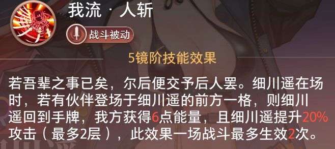 细川遥攻击力提升20%(可叠加2层,单场战斗最多触发2次)。