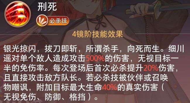 必杀技是细川遥的「斩首匕首」——首杀时500%攻击力的高爆发足以秒杀一众角色,而对队长的强制锁定能快速针对对方队长。更关键的是,当敌方用坦克/召唤物嘲讽时,40%最大生命的真实伤害能强行突破防御,对高血量造成致命打击。需注意释放时机:优先在敌方队长血量较低或队友已压低敌方整体血线时出手,最大化斩杀收益。