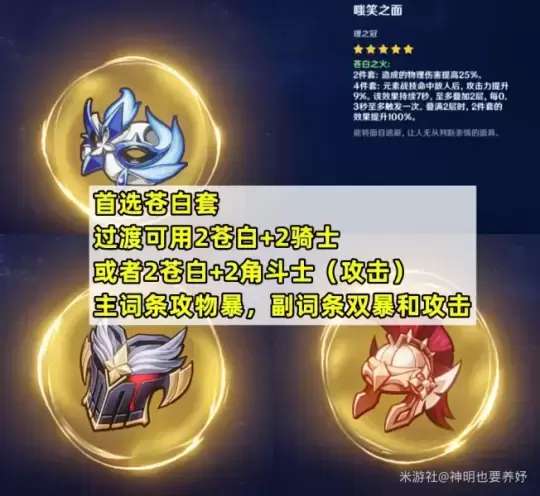 由于该角色主打物理伤害,因此最佳选择是使用苍白套装。在转型期间,可以选择苍白套装加上骑士套装或攻击两件套装,例如角斗士装备等。主要属性推荐使用攻击属性的沙漏、物理伤害杯子和双倍暴击头部装备。次要属性则可以选择双倍暴击和攻击属性。