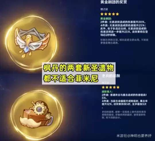 需要特别注意的是,由于菲米尼并没有主动释放技能扣血的机制,并且其输出不仅仅依赖于战技,所以枫丹的两套新圣遗物并不适合用于菲米尼。