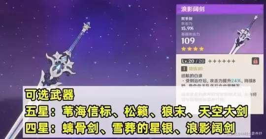 相反,加攻击力、双暴和物伤的武器菲米尼基本都可以用,所以选择很多。对于五星,可以选择苇海信标、松籁、狼末或者天空大剑;对于四星,推荐使用螭骨剑、雪葬的星银或者枫丹的锻造武器浪影阔剑。