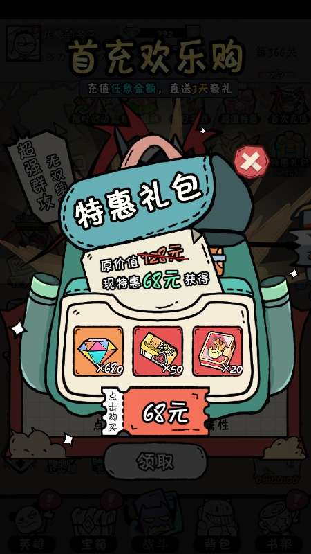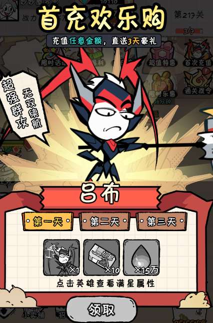 要说最对得起身价的便是游戏的首充礼包了,开局送三国第一武将吕布。吕布在游戏里面也是第一梯队的上单英雄了,有回复,有输出,无论闯关还是竞技场上都非常好使。