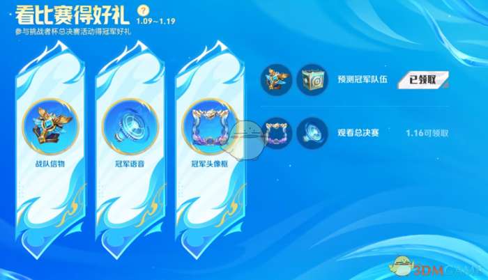 活动说明:完成预测冠军队伍任务、观看总决赛任务(1月11日挑战者杯总决赛),即可获得对应奖励。其中,冠军头像框和冠军语音需在挑战者杯总决赛结束后的次周版本更新后领取。