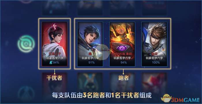 共计12名玩家参与游戏,玩家分为3队,每队由3名跑者和1名干扰者组成;
