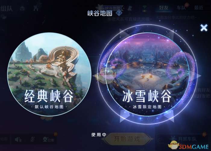 此外,冰雪峡谷地图上线期间,王者峡谷将默认为冰雪峡谷,玩家可通过组队大厅-峡谷地图切换,恢复默认峡谷地图。