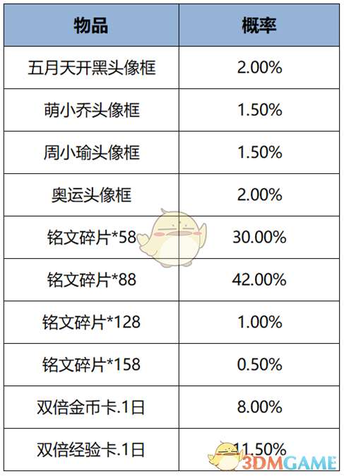 打开后可随机获得以下奖励之一:五月天开黑头像框、萌小乔、周小瑜、奥运头像框、双倍金币卡:1日、双倍经验卡:1日、铭文碎片x158/128/88/58。