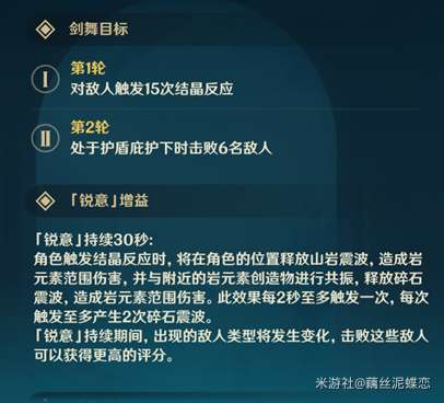 剑舞目标:第一轮,对敌人触发15次结晶反应;第二轮,处于护盾庇护下时击败6名敌人