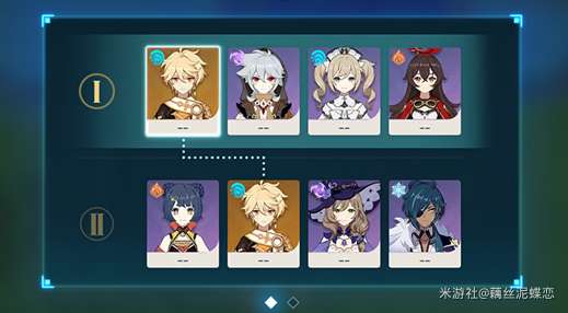 首先选择试用角色娜维娅。第一轮需要大量触发结晶反应,所以第二个角色建议选择凝光,娜维娅和凝光相互配合攻击。第二轮对护盾有要求,且要搭配娜维娅使用,所以第二个角色最好的选择是钟离,如果没有钟离,可以选择诺艾尔代替(如果诺艾尔的练度足够高,甚至可以直接无限大招单通)。关于第三位和第四位角色,可以根据自己拥有的角色自由选择,即使没有选择也可以带上凑元素共鸣的角色。此外,第二轮敌人没有自带元素附着,建议大家搭配一个可以在后台协调攻击的角色,以便触发结晶反应,提供娜维娅的伤害输出,这里我选择的是行秋。
