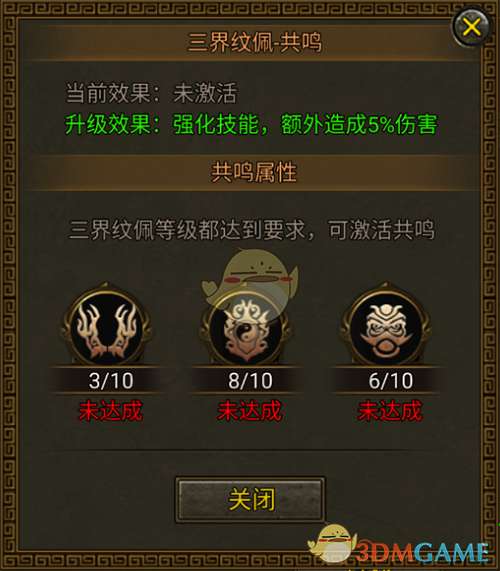 除了纹佩等级提升外,通过激活三界纹佩-共鸣也能够提升战力,在三界纹佩等级同时达到要求的等级后,将自动激活共鸣。共鸣升级能够带来技能强化,伤害增幅等强力提升。
