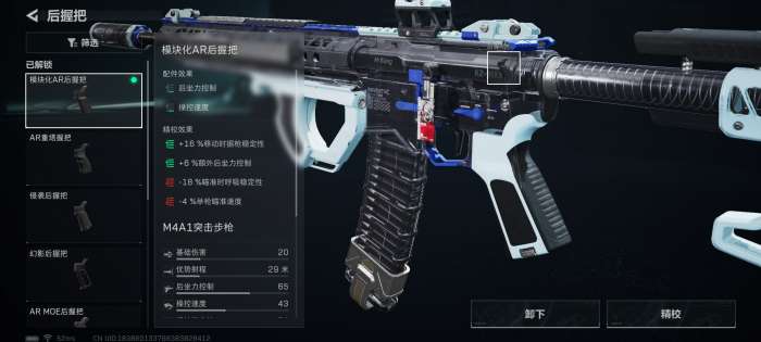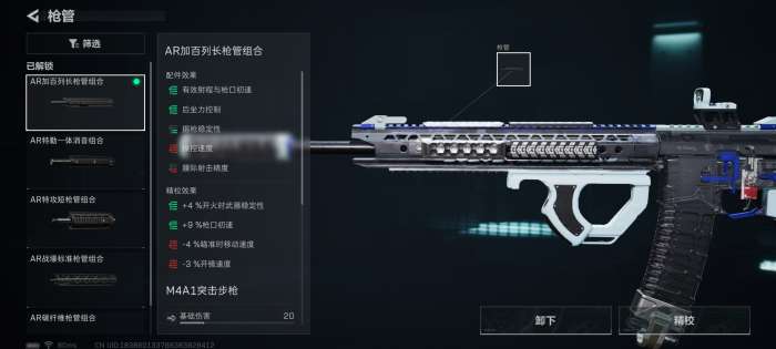 枪管选择AR加百利长枪管组合。这个枪管在M4A1这把枪枪中,不仅仅是在后坐力控制上面拥有一个亮点,同时在25米的优势射程上增加了4点变为29米,这对全面战场来说是必不可少的。