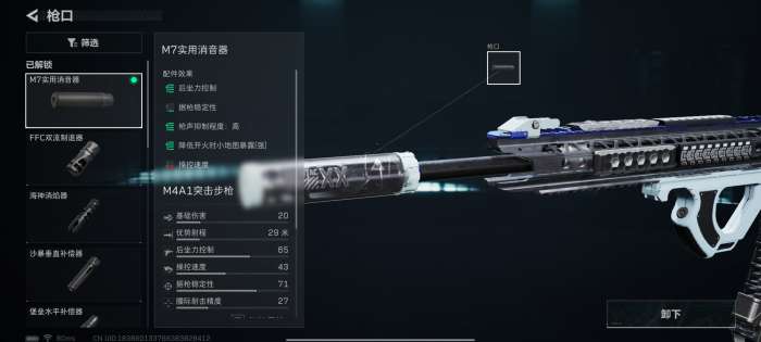枪口选择M7实用消音器。提升M4A1后坐力控制上面的不足,并最低成本的减少操控速度。