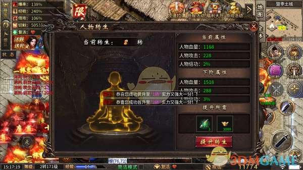 7、玩家可以就直接转生,转生不仅可以提升玩家的属性,还可以帮助你进入更高级的地图,以帮助更高级的装备。