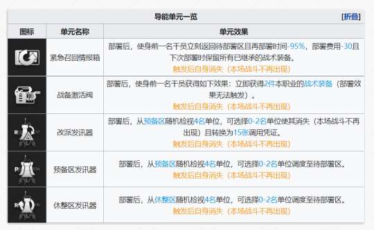 部署后,使一个干员立刻返回待部署区,并且该干员的再部署时间减少95%,部署所需费用减少30%。此外,该干员下次部署时将保留所有已装备的战术装备。