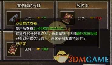 双倍修炼卷轴的来源只能通过商城花费10元宝进行购买,在前期的升级中起很大的作用,在使用十倍经验卷的同时额外获得两个小时的双倍经验!