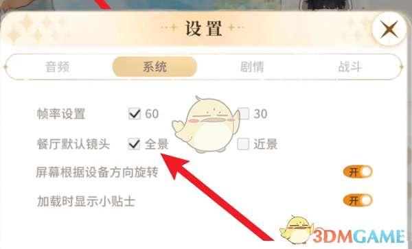 4、最后在系统设置页面找到餐厅默认镜头,勾选全景即可完成设置;