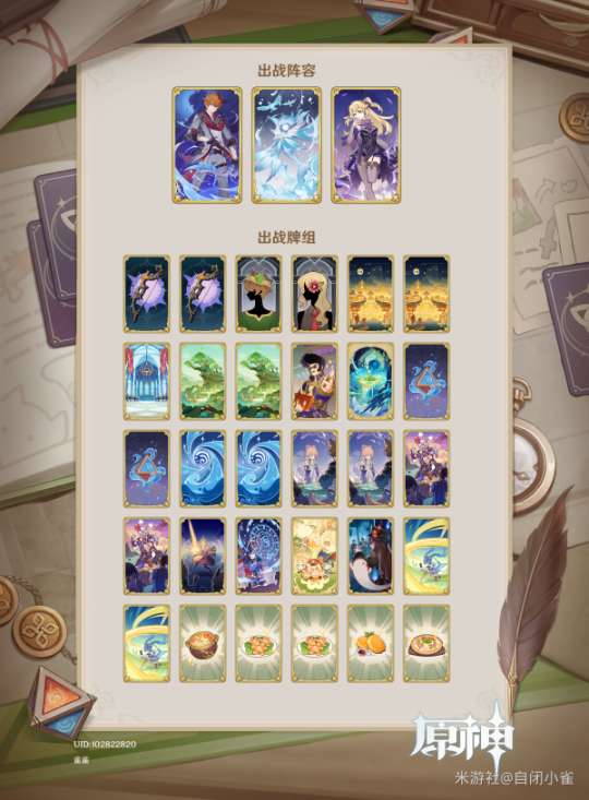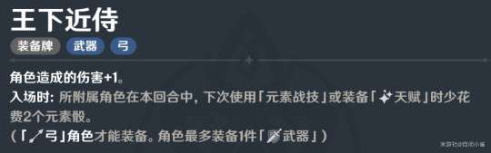 与其他使用黄金屋卡组的玩家不同,本套牌组不需要频繁使用达达利亚的元素战技,因此不需要携带藏锋行动牌。相比之下,王下近侍这把武器更加适合与藏锋搭配使用。可以说,这样做在一定程度上可以节省牌组的卡位。