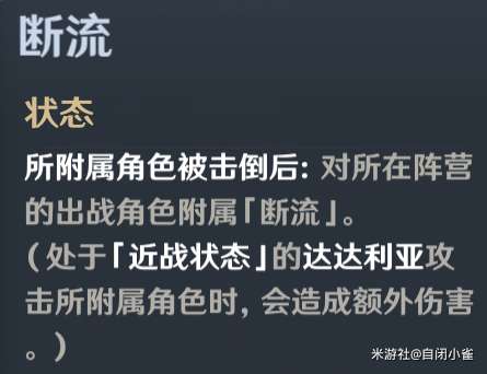 并且会随着出战角色被击倒后转移到下一位角色,而附属断流状态的角色被达达利亚攻击后,受到的伤害+1,并且对下一位后台角色造成1点穿透伤害,这意味着可以用这种方法实现永久的水光破镜效果,也就是可以让多个角色都带有此状态。尽管召唤物无法增加伤害,但是可以把策略转变为以达达利亚为主力出战角色,让它多次攻击,来最大化利用断流状态带来的增益效果,并且还能解决需要充值的问题。
