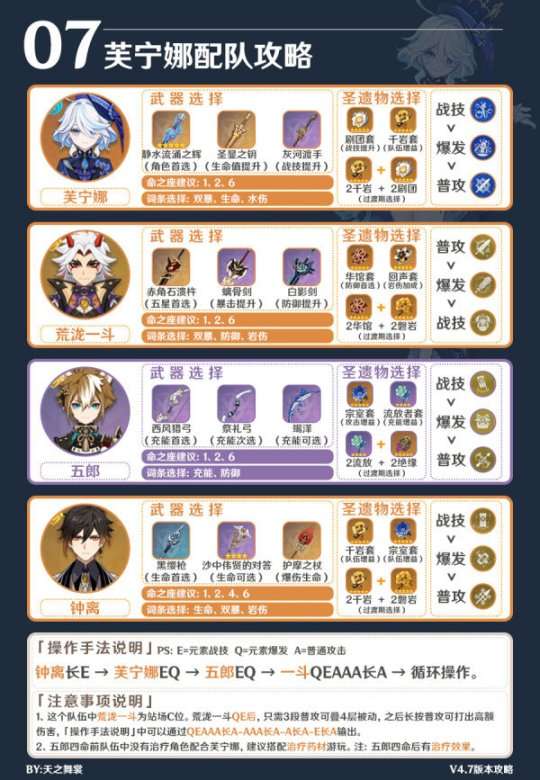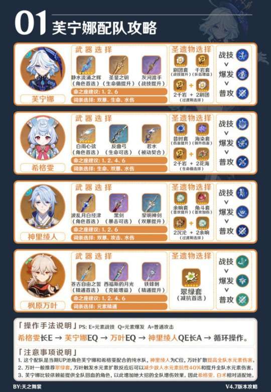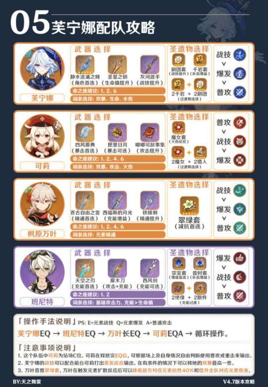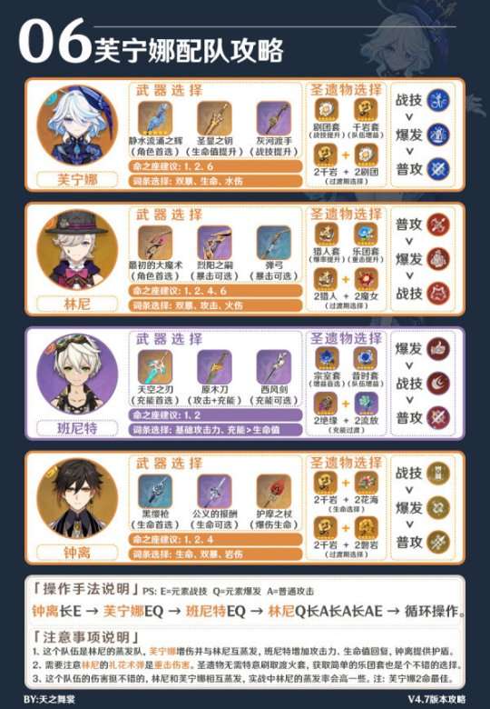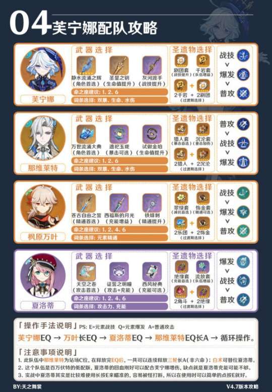 ◆ 天舞现在在广州街头编辑的芙宁娜攻略,目前时间不是很充裕,先把配队参考图片发出来,晚一点再根据需要补上解说。(笑死,天舞近期都在街头流浪)