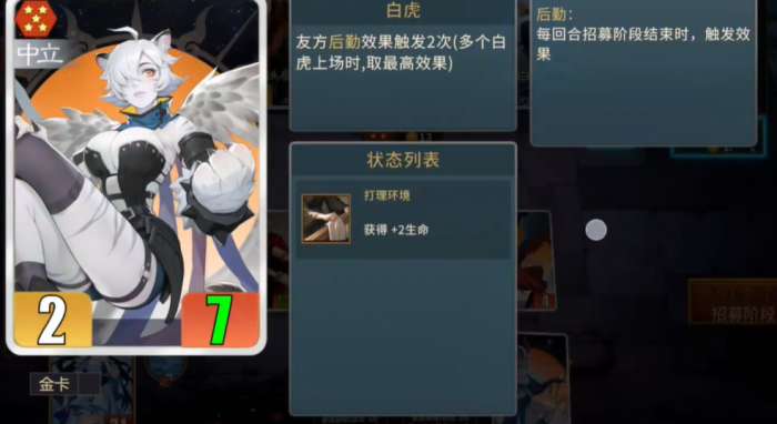 白泽和白虎如果能够协同组队,便是一个非常高效的产出体系,白泽可以为队伍提供更加稳定的产牌能力,对有白虎则可以让与它相邻单位的后勤效果持续放大到三倍,两个人的完美配合下可以让12张锦囊牌充足而稳定的供给,满足了对锦囊牌使用频率比较高的核心作战成员需求。