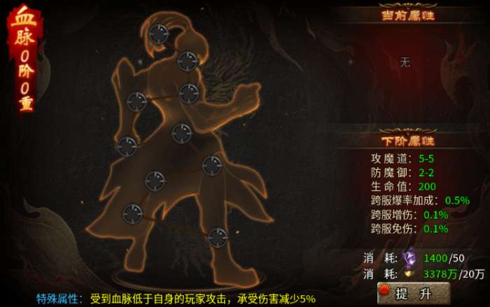 当然如果想要提升自己自身效果的话,这里建议大家前期一定不要错过血脉这个系统,在血脉系统当中,大家消耗更多的紫灵石以及元宝,就可以进行血脉提升,血脉提升当中,一个阶级里面还有不同的重级,所以每次提升一个阶级之后,大家就可以看到其中还有足够的跨服爆率加成,以及各种跨服增伤和跨服免伤数值变化,如果大家后期喜欢玩跨服战斗的话,这个血脉是非常重要的一类增强系统,跨服战斗时血脉低于自身的对手,大家受到的伤害也会减少5%,所以在后期的跨服作战当中,如果有血脉压制能力的话,大家是会有更多战斗功能可以用到的。