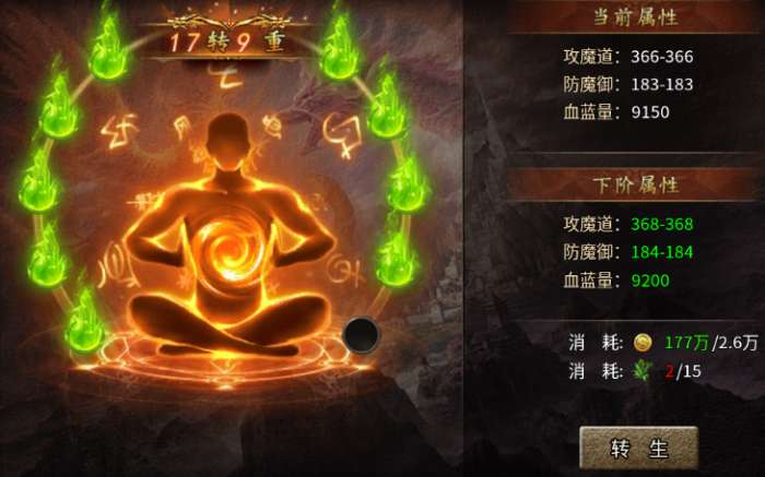 这款游戏当中一边挂机一边升级对于新手玩家来说还是比较容易的,另外就是转生这个系统是一定要快速提升起来的,转生系统其实在游戏当中就等于另类的一种等级系统,转生的层次越多的时候,在其中能够提升到的当前属性就越高,在转生提升的角色属性当中,大家可以看到其中最主要的攻魔效果里面带来的蓝量提升是非常高的,不过需要消耗的资源也比较多,这里大家要通过挂机获取更多的蛮荒币以及龙魂草,在前期初期的地图当中,大家都是有机会拿到这些基础的转生道具。