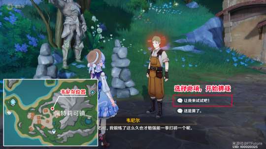在完成世界任务「谐律上的咏叙诗」终章「安魂曲」之前,在「佩特莉可镇」下图红点所示位置,与韦尼尔对话,选择选项「让我来试试吧」,开始挑战。
