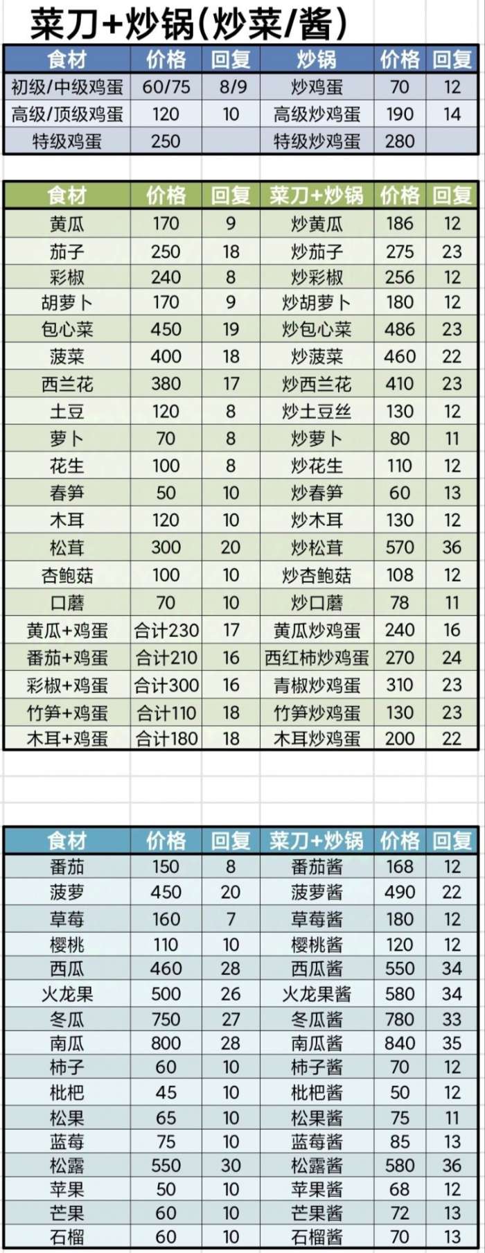 内容是五测食材成本以及做成菜后的价格和回复体力